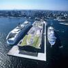 豪華客船が港に着岸しているような絵で、背景のマンションと重なってふと海外の風景のような錯覚を覚える。
