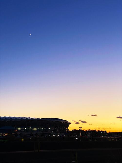 広い空の中にスタジアムの存在感が確かにあり、頭上の月も絶妙なタイミングである。