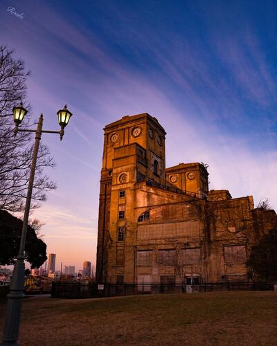 夕日と雲の流れも相まって時代の流れを想起させ、より建物の深みが増している。
