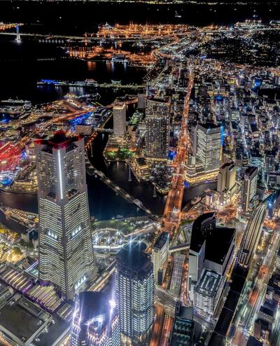 ランドマークタワーだけでなく、市役所、赤レンガ倉庫、大さん橋、遠くには横浜港シンボルタワーなど横浜を代表する建築がまるで宝石のように散りばめられ、普段は見ることができない特別な横浜を表現した作品である。