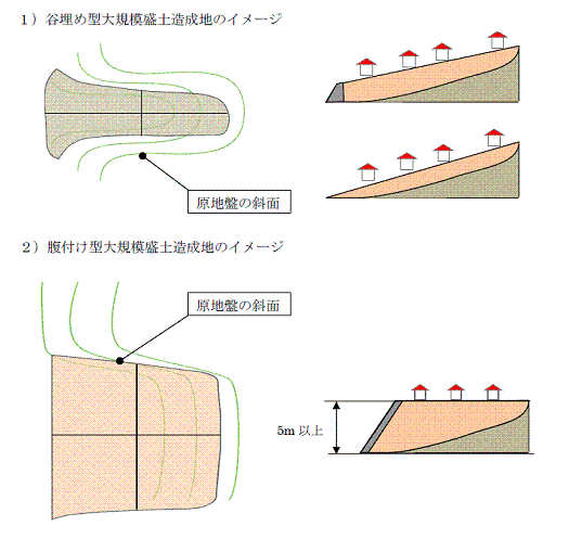 盛土の面積が3,000平方メートル以上(谷埋め型)又は盛土をする前の地盤面の水平面に対する角度が20度以上で、かつ、盛土の高さが5メートル以上(腹付け型)のものを調査の対象としました。
