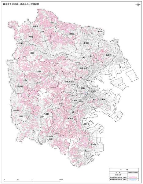 - 法の施行以後の造成は、港北ニュータウンに代表されるような、傾斜地の山を切り崩し、谷部を埋め立てて平坦化する大規模なもので、宅地造成や開発許可の基準に基づき造成されおり、市域北部(港北区、緑区、青葉区、都筑区)及び市域南部(港南区、金沢区、栄区)に多く見られます。