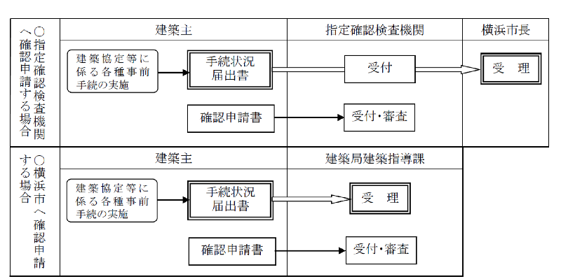 - 横浜市へ確認申請する場合は、届出書を横浜市長(窓口:横浜市建築局建築指導課)へ提出してください。