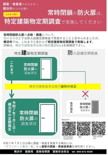 また、建築基準法令等の改正についての詳細は「 建築基準法の一部を改正する法律(平成30年法律第67号)について(外部サイト)」を、横浜市建築基準法施行細則の改正についての詳細は「 横浜市建築基準法施行細則」をご確認ください。
