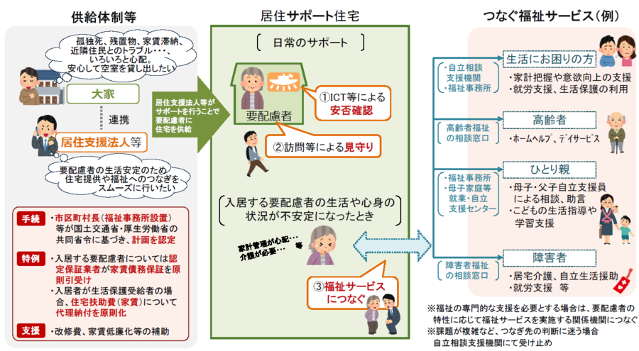 居住サポート住宅とは、居住支援法人等と賃貸人が連携し、高齢者や障害者、低所得者などの住宅確保要配慮者に対して入居中の居住サポート(安否確認・見守り・福祉サービスへのつなぎ等)を行う住宅のことです。