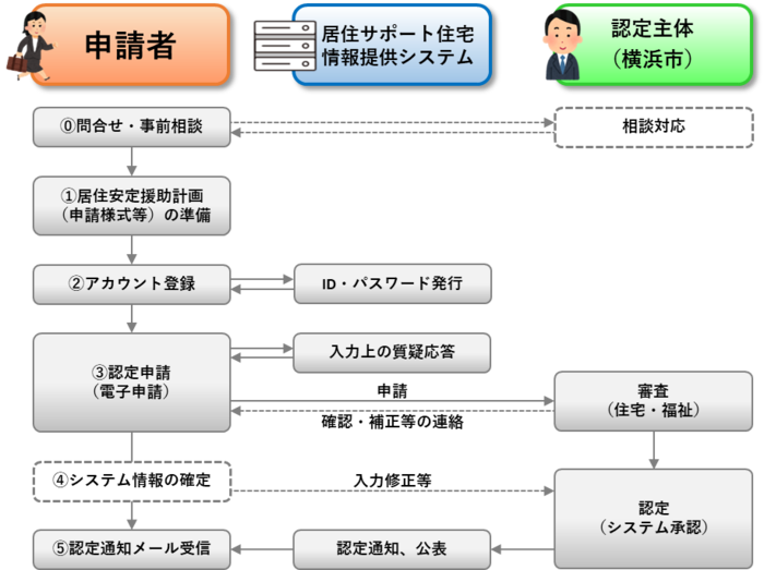 居住安定援助計画の認定申請は、申請者が専用ウェブサイト「(仮称)居住サポート住宅情報提供システム」から電子申請します。