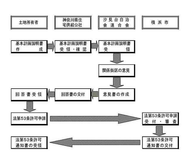 そのため都市計画法第53条許可申請前には事前協議が必要となります。事前協議及び都市計画法第53条許可手続きのフローについては下図をご確認ください。