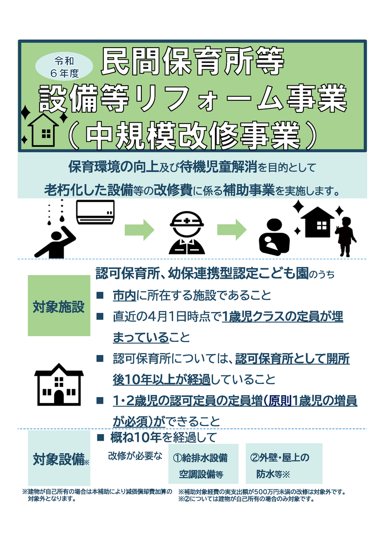 【ご案内】令和6年度民間保育所等設備等リフォーム事業(中規模改修事業)