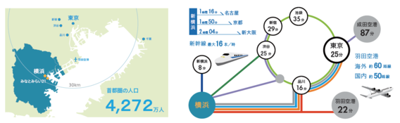 横浜は自動車産業をはじめとするものづくりやIT、ライフサイエンス産業などが集積しています。さらに、グローバル企業のR&D拠点が集まっています。また、国際会議や観光で国内外から多くの方々が訪れる街でもあります。