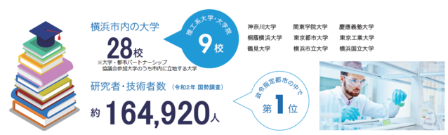 横浜市は学術都市を推進し、多くの優秀な人材が輩出されています。公的研究機関や、研究開発等への支援機関も立地しており、産学官連携による共同研究が活発に行われています。市内在住の専門的・技術的職業従事者も極めて多く企業の研究開発には最適の環境があります。