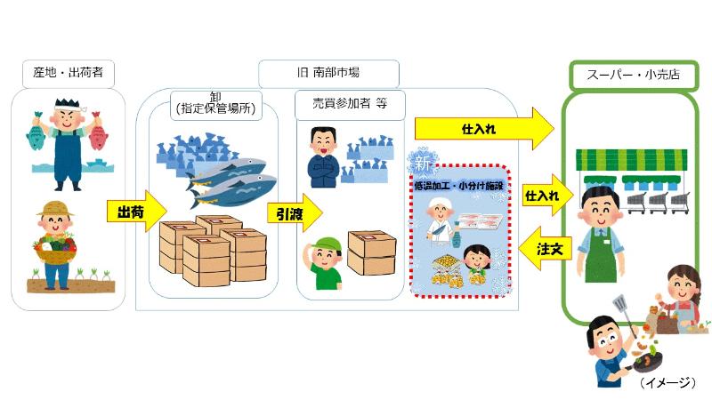 青果、水産の買出人の皆さんは、中央卸売市場廃止後の南部市場(以下、「旧南部市場」)内の各施設、店舗において、商品の受取または購入ができます。