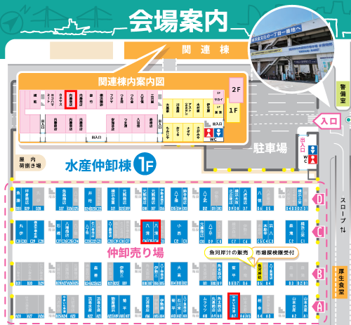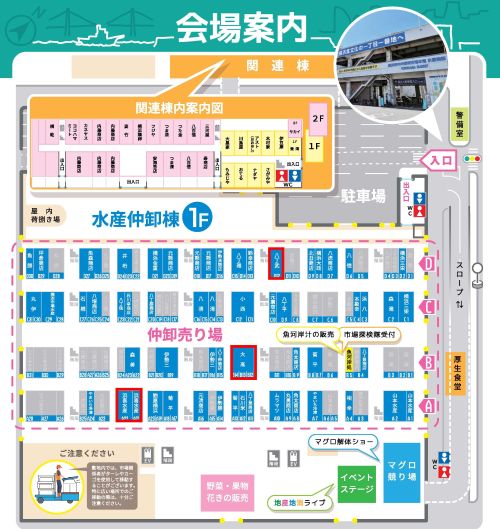 ※「魚河岸処」は同ホームページ内の「水産棟内1階案内図」をご確認ください。