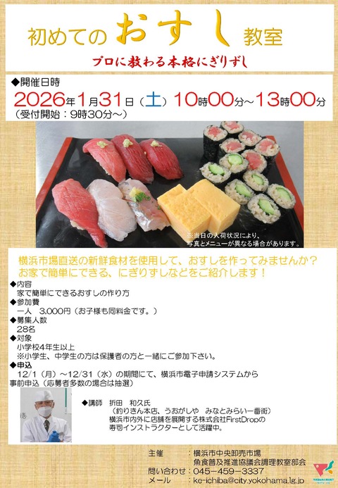 1月31日 | 初めてのおすし教室 | 横浜市電子申請システム(外部サイト)から申込 ※応募者多数の場合は、抽選となります。 ※抽選の結果は、連絡いたします。 |