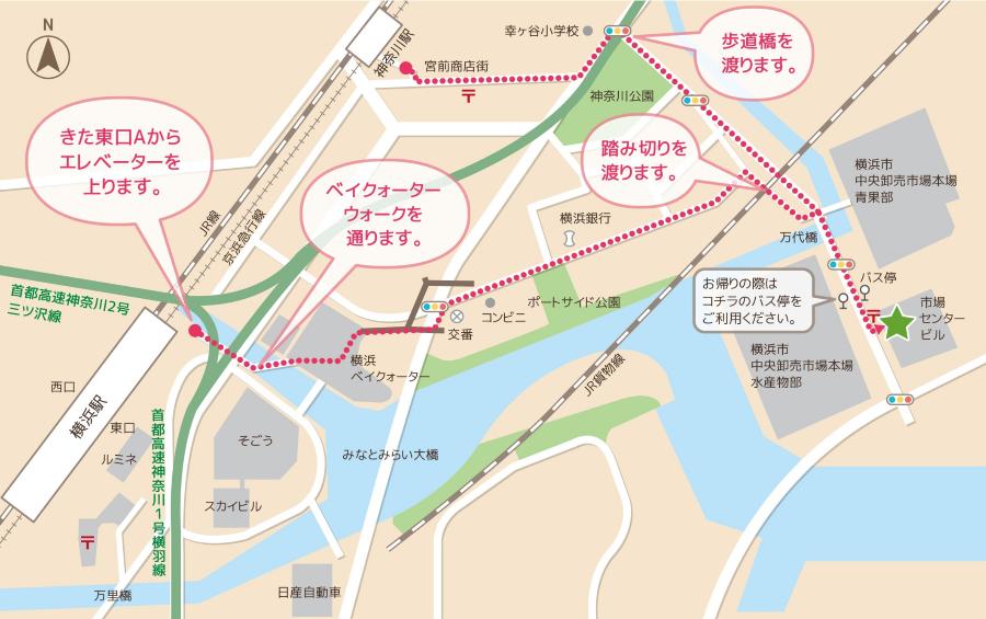 行き方 | 市営バス:横浜駅東口バスターミナル4番乗り場から、市営バス48系統「コットンハーバー」行「中央市場前」下車徒歩1分 |