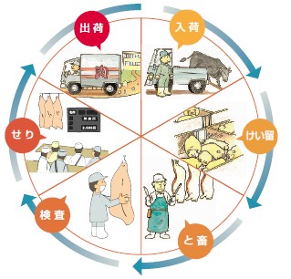 横浜食肉市場では、衛生管理の行き届いた施設において、全国から集荷した牛や豚を一貫した食肉生産ラインでと畜解体(枝肉の生産)から枝肉の部分肉加工までを行い、すべての食肉に対して万全な検査を実施した上で、安全で安心な食肉を市民の皆様にお届けしています。