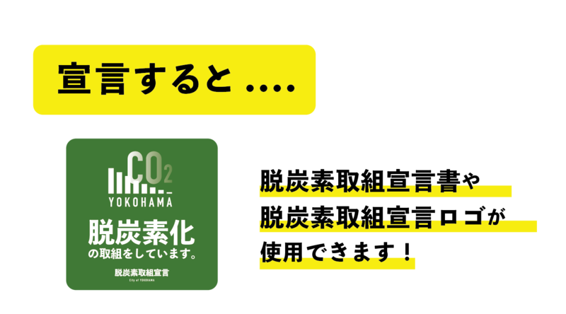 - 宣言をされた事業者の皆様を、脱炭素化に積極的に取り組む事業者として応援していくため、横浜市Webサイト上で事業者名等を公表いたします。 ※公表にお時間がかかる場合がございます。