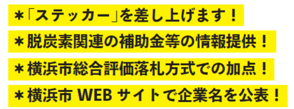 - 宣言をされた事業者のうち、市内中小企業等の皆様は省エネ診断の受診や設備投資の補助制度をご利用いただけます。また、「横浜市総合評価落札方式」の評価項目における加点など、各施策と連動しています。