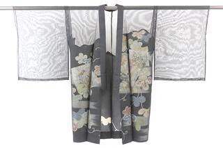 「縫い込み落とし羽織」は、紗の布地で仕立てています。裾の折り返しで絵柄を裁断し、裏に返して縫い目が表にほとんど見えないように縫い、他の箇所の縫込みは、極細く裁断し、同様に縫っています。この技法は明治時代からありますが、現代では殆ど見られなくなりました。