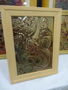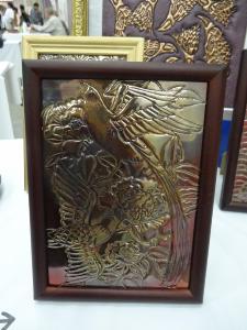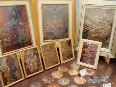 銅板を表から鏨(たがね)でたたいて文字や絵を浮き上がらせる工法「銅板鏨(たがね)打出し工法」で銅板画を作り、展示会へ出品するようになりました。