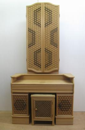 また、組子に用いる材料を正確に加工し、様々な模様を組み合わせた組子作りを得意とされ、三面鏡化粧台に組子を取り入れたり、球体の行燈を作成するなど、工夫を凝らした独創的なデザインの作品製作を手掛けてきました。
