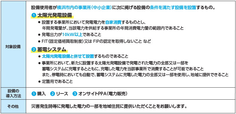 カーボンニュートラルの実現に向けて、横浜市内の中小企業が実施する太陽光発電設備の導入を支援します。また、本助成金は、神奈川県で実施する「神奈川県自家消費型再生可能エネルギー導入費補助金(外部サイト)(外部サイト)」との併用が可能です。家庭用の太陽光発電に関する事業については、「横浜グリーンエネルギーパートナーシップ事業」(YGrEP:ワイグレップ)のページをご覧ください。