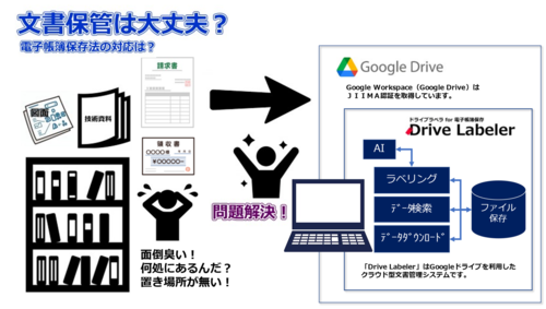 概要 | GoogleDriveに保存したファイルに検索用のラベルを付与し、クラウドに保管する電子文書管理補助ツールである。また、電子取引帳票を電子帳簿保存法の要件を満たす形式でクラウド環境に保存する。