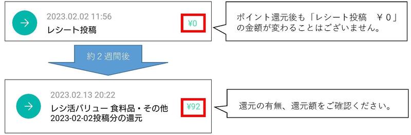 還元時の「レシ活バリュー食料品・その他 2023-xx-xx投稿分の還元 ¥●●」という表示にて還元の有無、還元額をご確認ください。