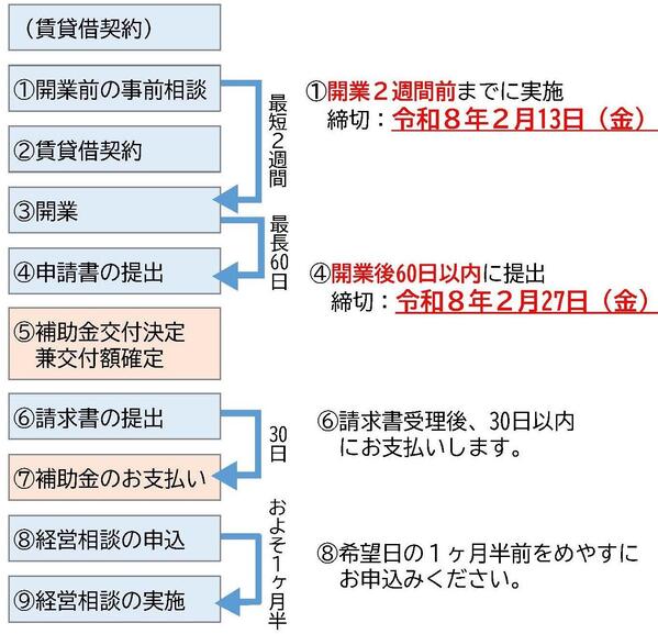 - 補助金の交付には条件があります。物件の候補が決まり、開業時期が具体化してきた段階で、必ず早めの事前相談をお願いします。