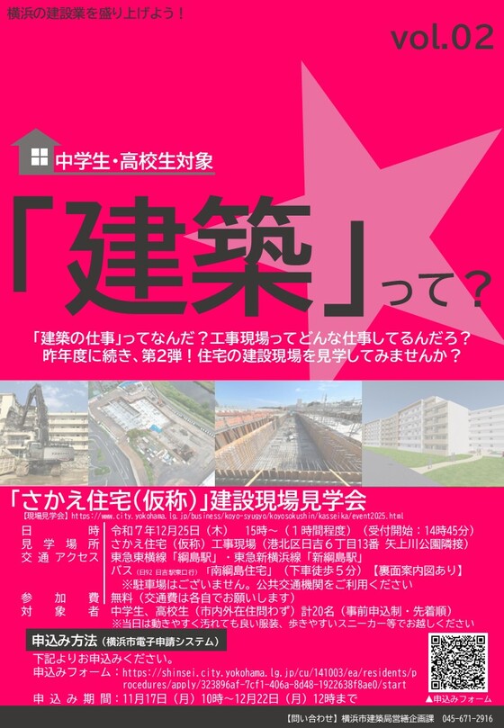 【事前申込制】12/25開催 「建築」ってなんだ?第2弾 「さかえ住宅(仮称)」建設現場にて中高生向け現場見学会を開催します!