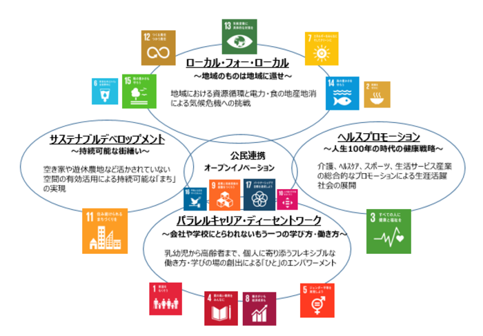 このビジョンによって、「循環社会」の実現を目指す「ローカル・フォー・ローカル」と「サステナブルデベロップメント」に加え、「共生社会」の実現を目指す「パラレルキャリア・ディーセントワーク」と「ヘルスプロモーション」の各分野における公民連携の実践を、地域に根差した持続可能な経済活動を推進するという視点から、結び付け、融合させて行きます。