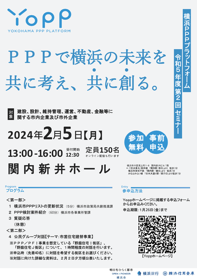 昨年度横浜市では、横浜PPPプラットフォーム:通称『Yopp(ヨップ)』を設立しました。令和5年度第2回セミナーを2024年2月5日(月曜日)に開催しますので、横浜市のPPP事業にご関心のある企業・団体の皆様のご参加をお待ちしております。