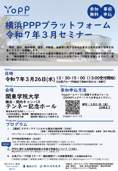 令和4年度に横浜市では、横浜PPPプラットフォーム:通称『Yopp(ヨップ)』を設立しました。令和7年3月セミナーを2025年3月26日(水曜日)に開催しますので、横浜市のPPP事業にご関心のある企業・団体の皆様のご参加をお待ちしております。