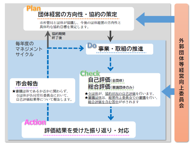 本市では、外郭団体等経営向上委員会を活用するとともに、「協約マネジメントサイクル」の取組を進め、市と外郭団体が一体となって、絶えず経営向上を図ることとしています。