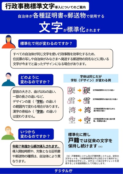 すべての自治体が同じ文字を使い行政事務を効率化するため、各種証明書や発送する郵送物などに用いる文字が今までと違ったデザインになる場合があります。