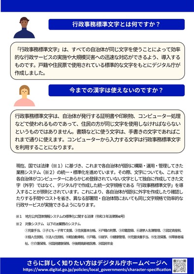 「行政事務標準文字」は、すべての自治体が同じ文字を使うことによって効率的な行政サービスの実施や大規模災害への迅速な対応ができるよう、導入するものです。戸籍や住民票で使用されている標準的な文字をもとにデジタル庁が作成しました。