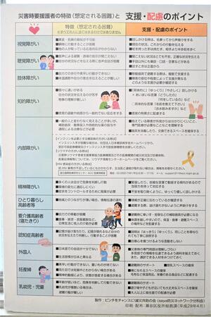 こういった「災害時要援護者の特徴と支援・配慮のポイント」をリーフレットにして、区内の地域防災拠点に配布していただきました。