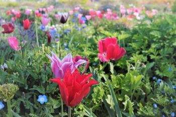 チューリップ、スイセン、ムスカリなどの春咲き球根を混ぜてランダムにばらまいた「球根ミックス花壇」は、季節に応じて変化する魅力的な景色を長く楽しむことができます。
