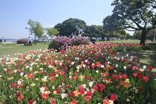 まず初めに訪れたのは、新港中央広場。色とりどりのチューリップが出迎えてくれました。