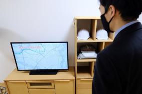 まず初めに体験したのが減災トレーニングルームです。在宅時に台風が接近中の場合、どのような行動をするのが適切か学ぶことができます。家の周辺状況を把握できる地図(ハザードマップ)や、テレビから流れる情報を頼りに行動し、自分の判断が適切であったかどうかを学びました。