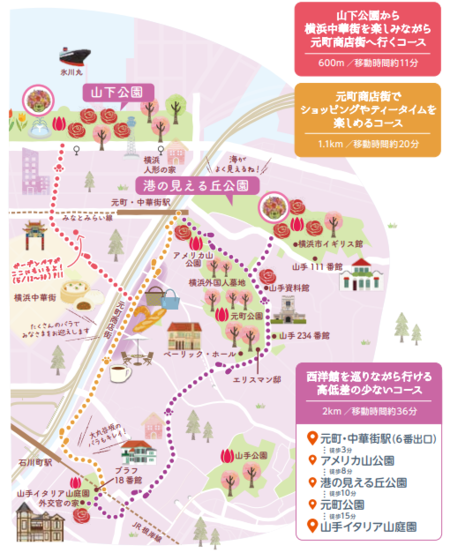 ガーデンネックレス横浜では、花を見ながら横浜の景色を楽しむことができる、散策コースをいくつかご用意しています。山下・関内エリア、みなとみらい・馬車道エリア、新横浜エリアなど、市内各所の様々な散策コースを公式ガイドブックでご紹介しています。どちらも30分から1時間程度で歩ける手軽な散歩道です。今回は、その中から、元町・山手エリアの散策コースを巡ってみました。