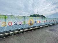 JR「根岸」駅から市営バスに乗り、「本牧市民公園前」で降りると、すぐ目の前に市民プールがあります。自転車で近くを通る人が横断幕に目を留めており、地元の皆さんの期待感が伺えます。