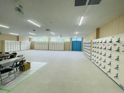 エントランスの左側には、男女合わせて700人分の広々とした更衣室が用意されています。もちろん、利用後のシャワー設備も整備されています。