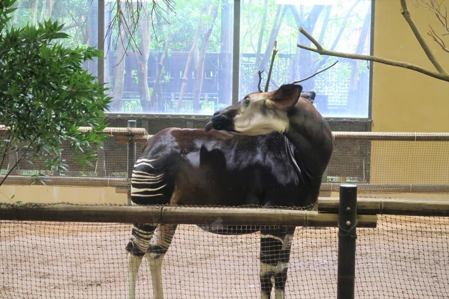 ズーラシアのオカピの展示場は屋外と屋内に分かれており、屋外展示場では、森の生い茂った野生のオカピの暮らしに近い環境が整備されています。また、屋内展示場では、熱帯雨林に暮らすオカピが快適に過ごせるよう、暖房による温度管理や湿度の調整が行われています。