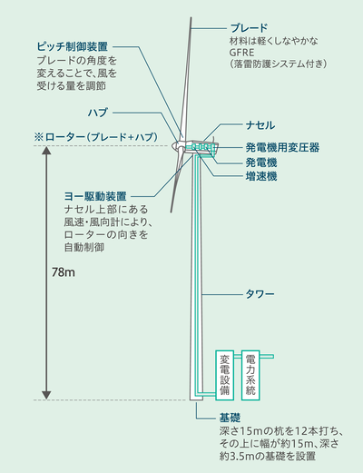風を大きなブレードで受け止めると、ローターが回転し、その回転がローターの後ろにあるナセルに伝わります。ナセルの中では、増速機という機械が、ローターから伝わってきた回転のスピードをさらに速くし、より速くなった回転の力を発電機に伝えて、電気に変えています。