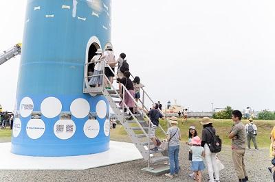 ハマウィングを近くで見るとかなりの迫力です。遠くから見た時には気が付かなかったのですが、タワーには水玉模様がデザインされており、ところどころに横浜の移り変わりが分かるイラストが描かれています。