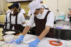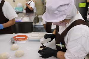 10時から、敷地内にあるベーカリー&カフェでパンを販売するため、調理室は目のまわるような忙しさ。前日から準備して寝かしておいたパン生地を、いろいろな形や味付けに成形していきます。
