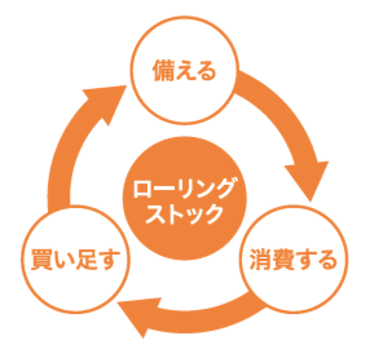 備蓄品を用意するにあたり、有効な手法がローリングストックです。ローリングストックとは、多めにストックして備える→食べて消費する→消費した分買い足す「循環型備蓄」のことです。これを繰り返すことで、賞味期限切れを防いだり、非常食に食べ慣れておくことで、環境が変わってしまう災害時の中で、日常生活に近い食生活を送ることができます。ローリングストックの方法(外部サイト)についてはこちらの動画を参考にしてください。