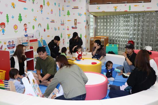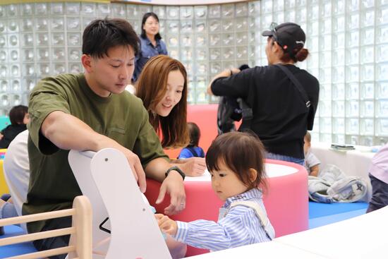 そして、プレイルームには同世代の子どもと保護者などがたくさん遊びに来るため、子育ての悩みなど、いろいろな話ができて、知り合いが増える場にもなっています。子どもたちの楽しそうな笑顔のそばで、お父さん、お母さんたちの輪もひろがっていました。