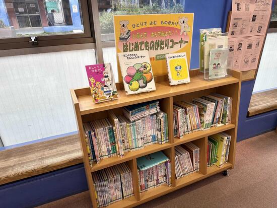 ※「はじめてものがたりコーナー」: 左から「おしゃべり ゆわかし」佐藤さとる(作) 村上勉(絵) あかね書房、「ワニのライバルとたんじょうパーティー」B・ウェーバー(作) 小杉佐恵子(訳) 大日本図書、「はじめてのキャンプ」林明子(作、絵) 福音館書房