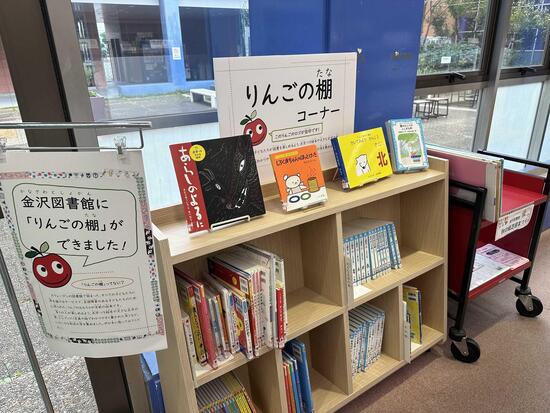 ※「りんごの棚コーナー」:左から「あらしのよるに」きむらゆういち(文) あべ弘士(絵) 講談社、「しろくまちゃんのほっとけーき」わかやまけん(作) もりひさし(作) わだよしおみ(作) こぐま社、「かいてみよう かんじ3」たかはしこうこ(絵) 社会福祉法人桜雲会、「霧のむこうのふしぎな町」柏葉幸子(作) 杉田比呂美(絵) 講談社